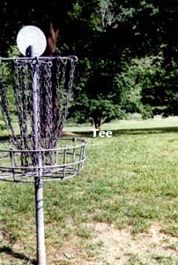 Hole #9.....When I designed this hole, the 2 large maples that stand right in front of the tee were not this large. There used to be a nice opening between the trees that you could throw through.....You notice that I said "used to be". The 2 large maples now provide a large wall that only tree surgeons can throw through. The Pole Hole lies about 30 feet above the tee with another maple protecting the right side of the fairway near the hole. A large drainage area runs perpendicular to the fairway and about 8 feet behind the Pole Hole. This drainage area is about 20 feet deep, so you don't want to go long. This is a tough hole, but once you learn its little secrets, it will usually let you par the hole.